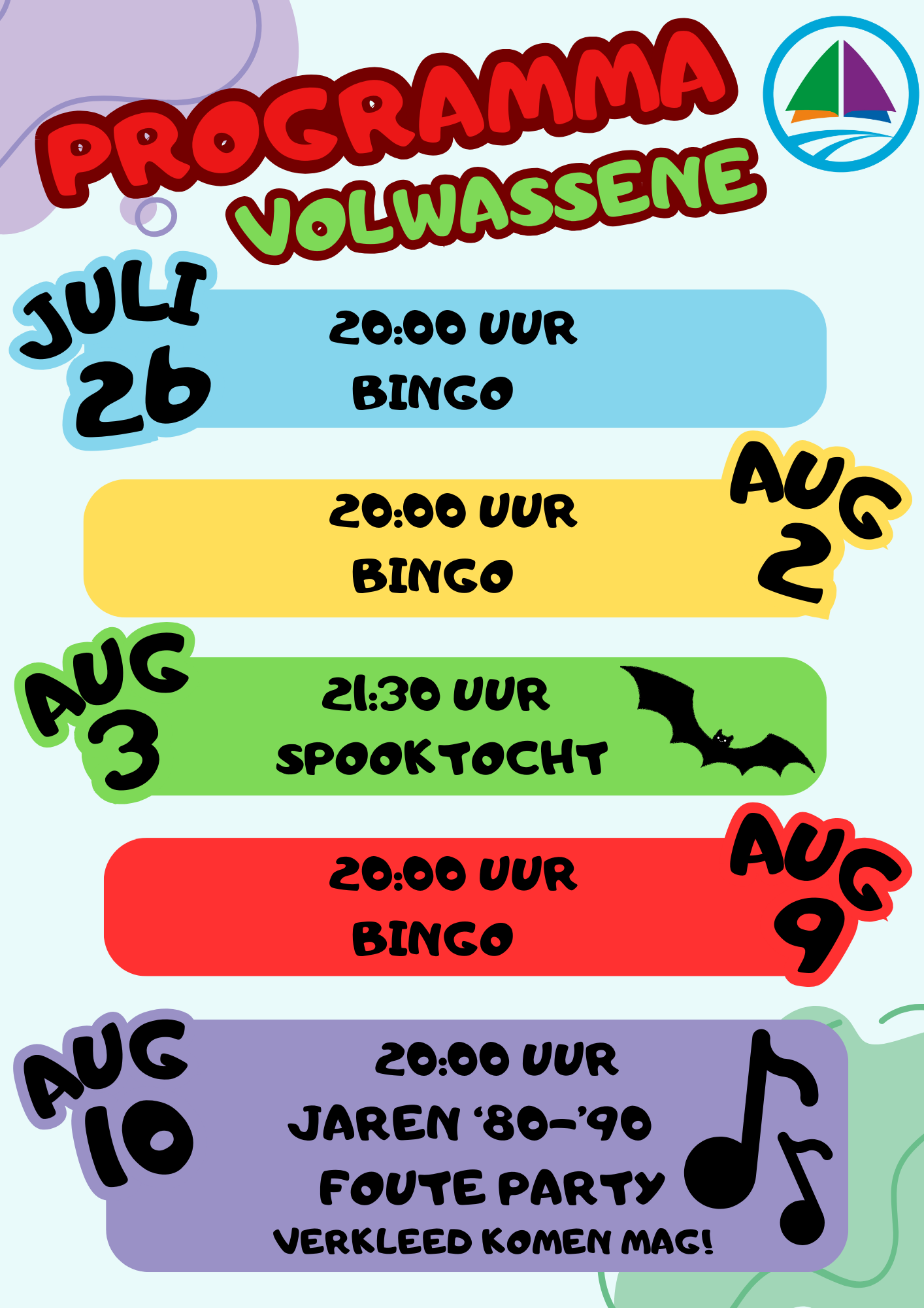 In de zomer organiseert het recreatieteam dagelijks leuke activiteiten voor de kinderen. Nieuwsgierig, download dan snel het weekprogramma! Download het recreatieprogramma Animatieprogramma 20 juli tm 11 augustus 2024.pdf Programma volwassene.png Spooktocht is op zaterdag 3 augustus 2024! Spingkussenfestival is op woensdag 7 augustus 2024!